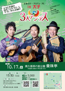 10/17(金)3人アンデス@大子「奥久慈茶の里公園・曼珠亭」 イベント詳細 日付: 2025年10月17日 <日付>10/17(金) <開場>13:00 <開演>13:30 <場所>奥久慈茶の里公園「曼珠亭」 <住所>茨城県久慈郡大子町左貫1920 <入場料>一般3,000円 / 大学・高校生2,000円 / 小中学生1,000円 / 未就学児無料 <予約はこちらから>https://forms.gle/fKgXKK44eBGvfjgw9 桑原健一 日本で数少ないプロ・チャランゴ奏者 1983年生まれ。2018年末まで合計10年間ボリビアで音楽活動をしていた。 2017年にはアイキレ国際チャランゴコンクール国際部門金賞受賞。 現在は日本初のチャランゴ系YouTuberとしても活動中。 現・東京リャマ計画、3人アンデス。 元・ワイラ・ハポナンデス、チュパイチャキス。 前 12/3(水)3人アンデス@別府「TAKITO」 最近 11/18(火)3人アンデス@上富良野「ゐーまーる」