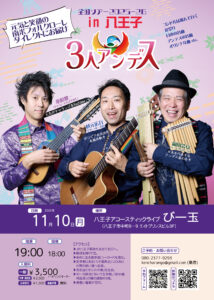 11/10(月)3人アンデス@八王子「びー玉」 イベント詳細 日付: 2025年11月10日 <日付>11/10(月) <開場>18:00 <開演>19:00 <場所>八王子アコースティックライブ「びー玉」 <住所>八王子市中町8-9エイトプリンスビル2F <入場料>一般3,500円 / 大学・高校生2,500円 / 小中学生1,500円 / 未就学児無料(+1ドリンクオーダー) <予約はこちらから>https://forms.gle/iKqmr4yP8mJpRruw5 桑原健一 日本で数少ないプロ・チャランゴ奏者 1983年生まれ。2018年末まで合計10年間ボリビアで音楽活動をしていた。 2017年にはアイキレ国際チャランゴコンクール国際部門金賞受賞。 現在は日本初のチャランゴ系YouTuberとしても活動中。 現・東京リャマ計画、3人アンデス。 元・ワイラ・ハポナンデス、チュパイチャキス。 前 10/18(土)3人アンデス@米沢「ブリティッシュカフェ」 最近 12/21(日)3人アンデス@那珂川町「那珂川町馬頭総合福祉センター」