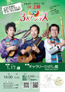 1/17(土)3人アンデス@上郡「ギャラリーひがし蔵」 イベント詳細 日付: 2026年1月17日 <日付>1/17(土) <開場>13:30 <開演>14:00 <場所>ギャラリーひがし蔵 <住所>赤穂郡上郡町上郡825 <入場料>一般3,500円 / 大学・高校生2,000円 / 小中学生1,000円 / 未就学児無料(1ドリンク込) <予約はこちらから>https://forms.gle/xAxVXM8pZyAGY4WR8 桑原健一 日本で数少ないプロ・チャランゴ奏者 1983年生まれ。2018年末まで合計10年間ボリビアで音楽活動をしていた。 2017年にはアイキレ国際チャランゴコンクール国際部門金賞受賞。 現在は日本初のチャランゴ系YouTuberとしても活動中。 現・東京リャマ計画、3人アンデス。 元・ワイラ・ハポナンデス、チュパイチャキス。 前 11/6(木)3人アンデス@神戸「元町always」 最近 12/18(木)3人アンデス@鎌倉山「エンクエントロ」
