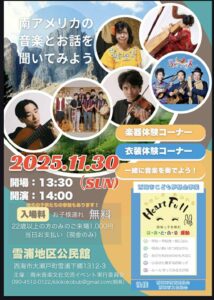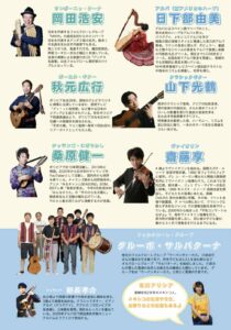 11/30(日)3人アンデス@西海・雪浦「雪浦地区公民館」 イベント詳細 日付: 2025年11月30日 <イベント名>南アメリカの音楽とお話を聞いてみよう <日付>11/30(日) <開場>13:30 <開演>14:00 <場所>雪浦地区公民館 <住所>西海市大瀬戸町雪浦下郷1312-3 <入場料>お子様連れ無料:22歳以上の方のみご来場1000円(当日払い・現金のみ) <出演>日下部由美、山下光鶴、齋藤享、峯川アリシア、朝長孝介、グルーポ・サルバターナ、3人アンデス(順不同、敬称略) 桑原健一 日本で数少ないプロ・チャランゴ奏者 1983年生まれ。2018年末まで合計10年間ボリビアで音楽活動をしていた。 2017年にはアイキレ国際チャランゴコンクール国際部門金賞受賞。 現在は日本初のチャランゴ系YouTuberとしても活動中。 現・東京リャマ計画、3人アンデス。 元・ワイラ・ハポナンデス、チュパイチャキス。 前 10/25(土)3人アンデス・ミニライブ@王寺やわらぎ会館