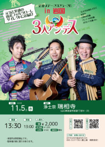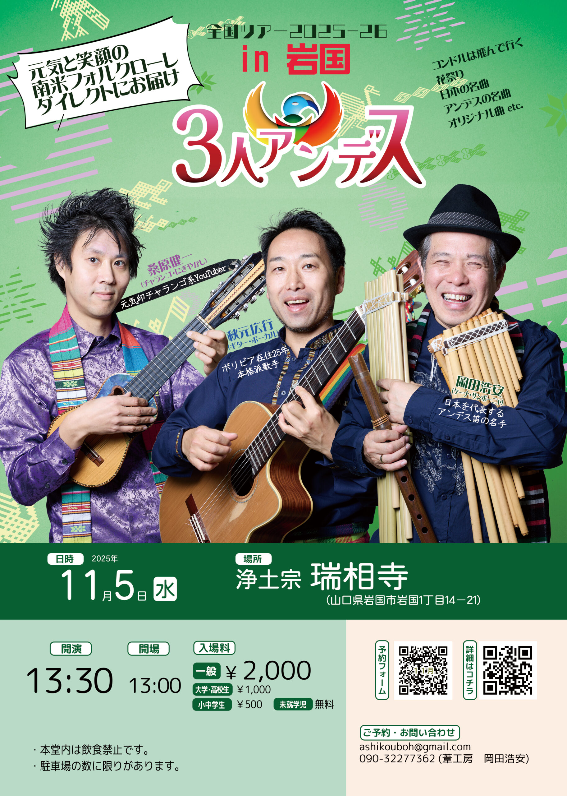 11/5(水)3人アンデス・岩国「瑞相寺」 イベント詳細 日付: 2025年11月5日 <日付>11/5(水) <開場>13:00 <開演>13:30 <場所>浄土宗・瑞相寺 <住所>山口県岩国市岩国1-14-21 <入場料>一般2,000円 / 大学・高校生1,000円 / 小中学生500円 / 未就学児無料 <予約はこちらから>https://forms.gle/iKqmr4yP8mJpRruw5 桑原健一 日本で数少ないプロ・チャランゴ奏者 1983年生まれ。2018年末まで合計10年間ボリビアで音楽活動をしていた。 2017年にはアイキレ国際チャランゴコンクール国際部門金賞受賞。 現在は日本初のチャランゴ系YouTuberとしても活動中。 現・東京リャマ計画、3人アンデス。 元・ワイラ・ハポナンデス、チュパイチャキス。 前 11/14(金)3人アンデス@久喜「どんぐり」 最近 11/29(土)3人アンデス・長崎「松本ホール」
