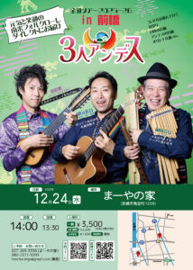 12/24(水)3人アンデス@前橋「まーやの家」 イベント詳細 日付: 2025年12月24日 <日付>12/24(水) <開場>13:30 <開演>14:00 <場所>まーやの家 <住所>前橋市亀里町1209 <入場料>一般3,500円 / 大学・高校生2,500円 / 小中学生1,000円 / 未就学児無料(お茶とお菓子付き) <予約はこちらから>https://forms.gle/oPK9yVFBK5H873VP6 桑原健一 日本で数少ないプロ・チャランゴ奏者 1983年生まれ。2018年末まで合計10年間ボリビアで音楽活動をしていた。 2017年にはアイキレ国際チャランゴコンクール国際部門金賞受賞。 現在は日本初のチャランゴ系YouTuberとしても活動中。 現・東京リャマ計画、3人アンデス。 元・ワイラ・ハポナンデス、チュパイチャキス。 前 12/23(火)3人アンデス@松田町「カバーニャ」 最近 12/25(木)3人アンデス@つくば「ジークレフ」